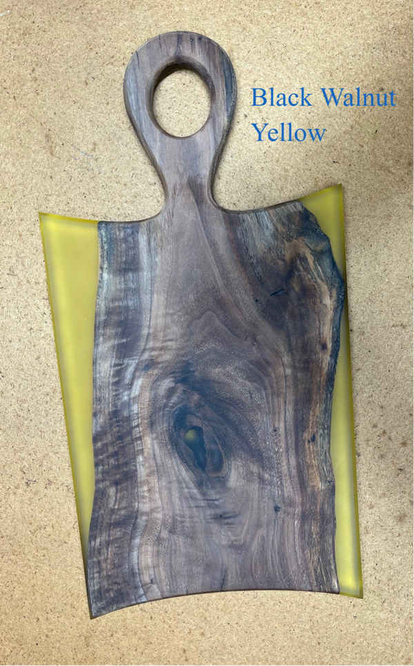 Wooden charcuterie board with colored resin. Different colors available. Wood species, design, and resin hue varies. Please check label on picture when making purchase selection.
