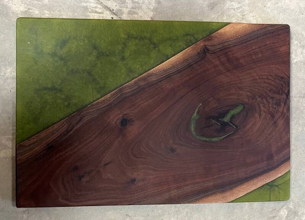 Geen and grey honeycomb pattern resin and black walnut wood charcuterie board. Pictures show front and back of the board.