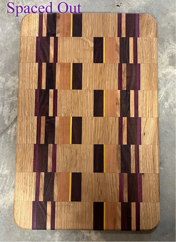 Wooden cutting boards with Purple Heart, Osage Orange, White Oak, Black Walnut, and Cherry woods laid out in intricate patterns. Routered edge on one side to pick up easily.