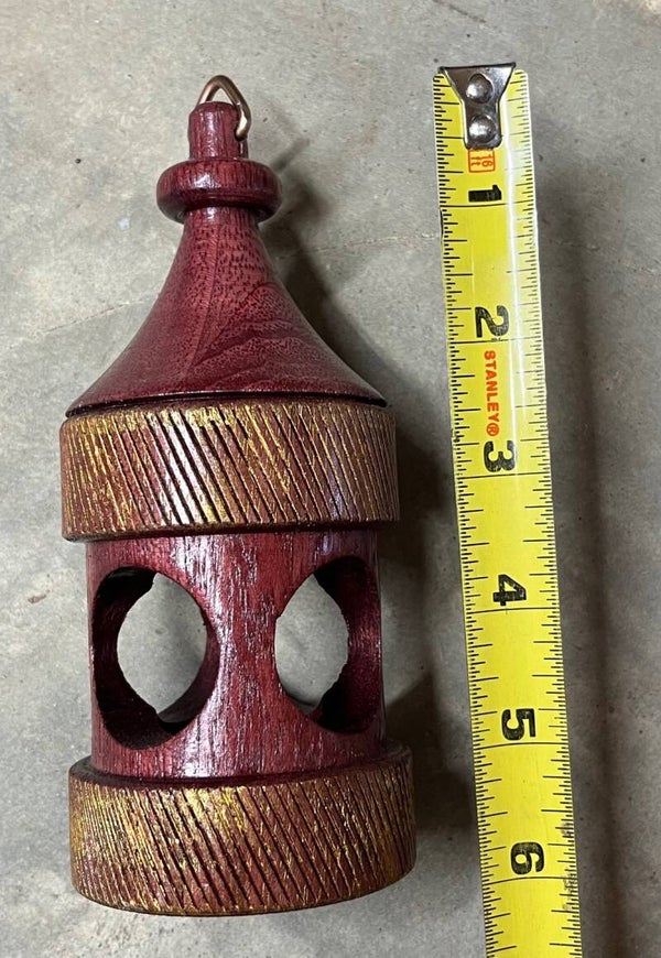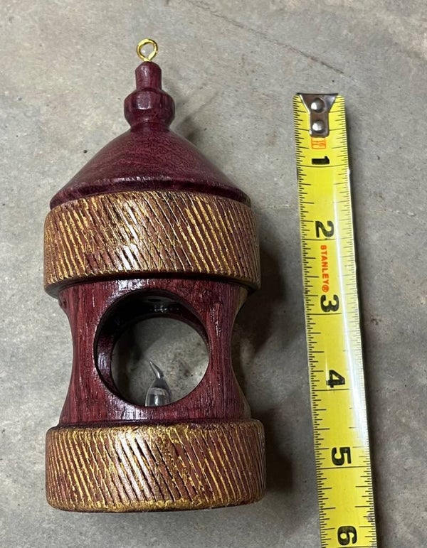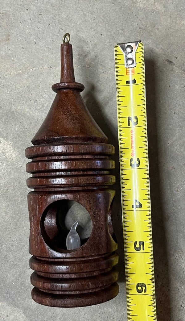 Wooden ornaments with circular windows to reveal flickering, battery operated, "candles". Each ornament is handmade with various details and finishes. See photos for height and details.
