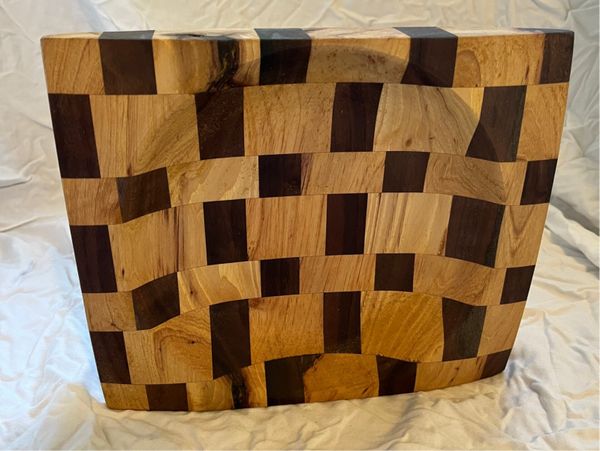 This intricate bowl is made of hickory and black walnut in a oblong checkered pattern. It is a great display piece that could also be used as a catch all.